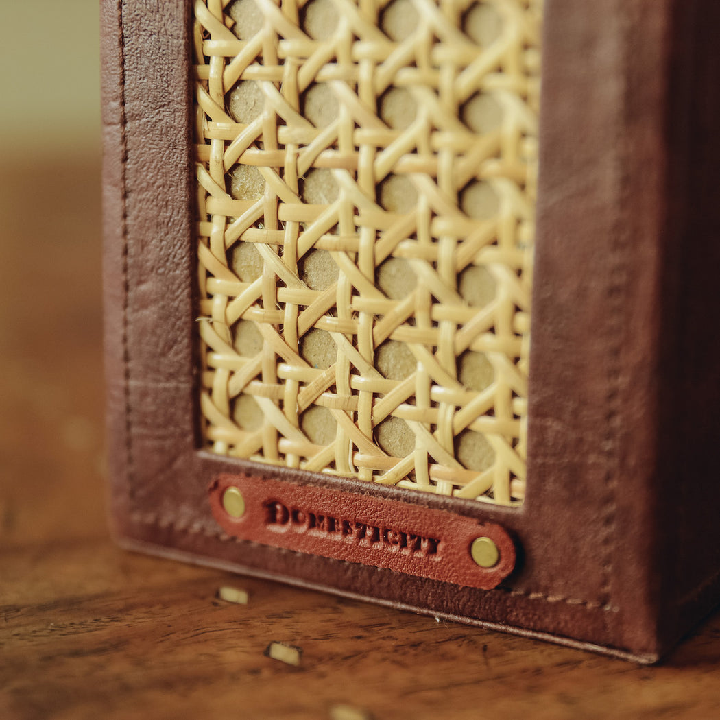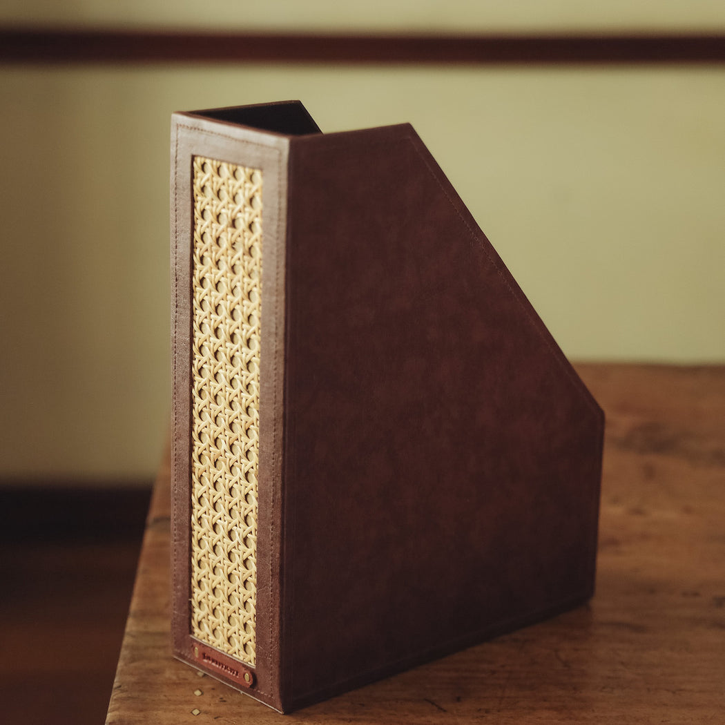 Made from dark brown faux leather and woven solihiya matting.