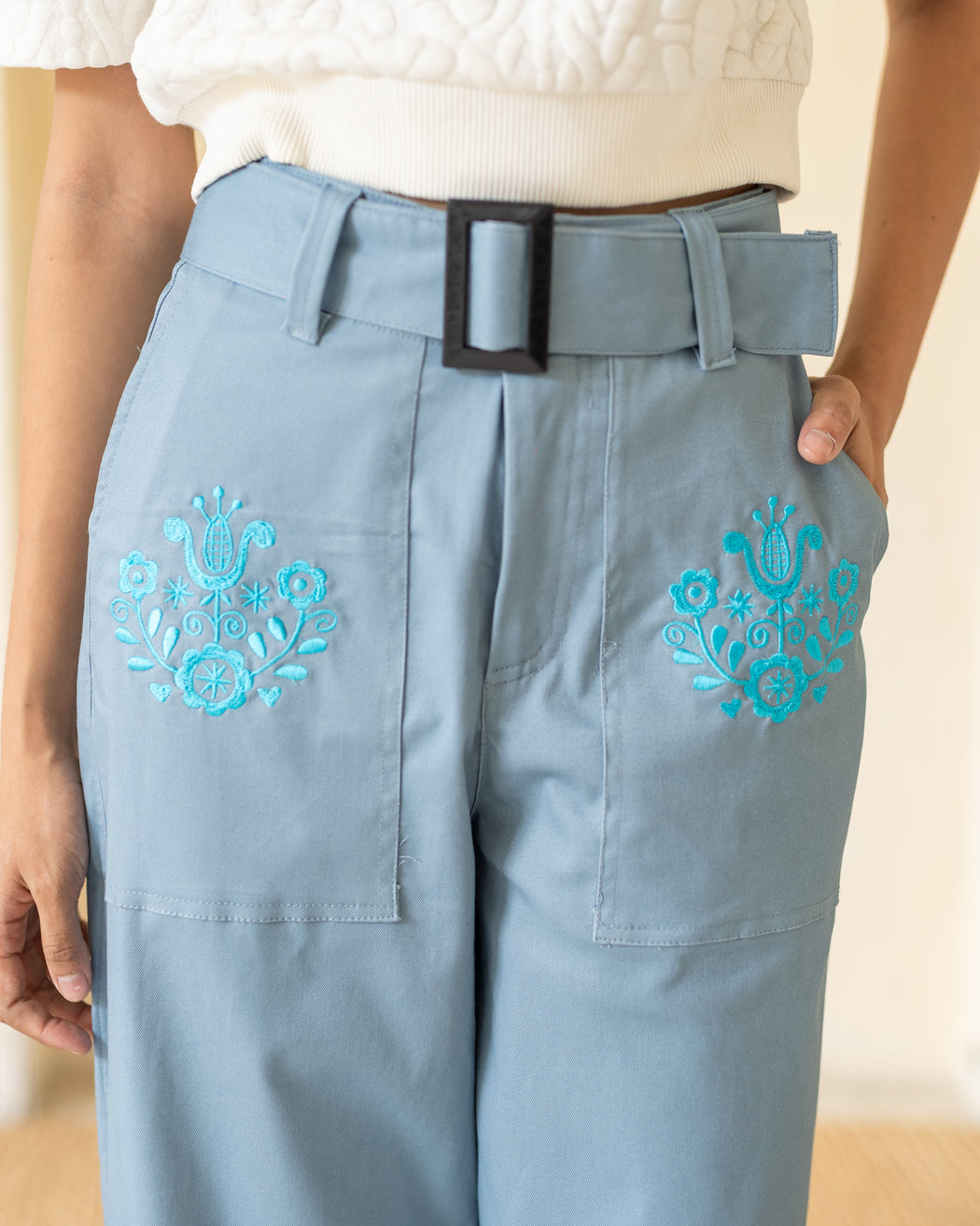 Features embroidered floral patterns on pockets.