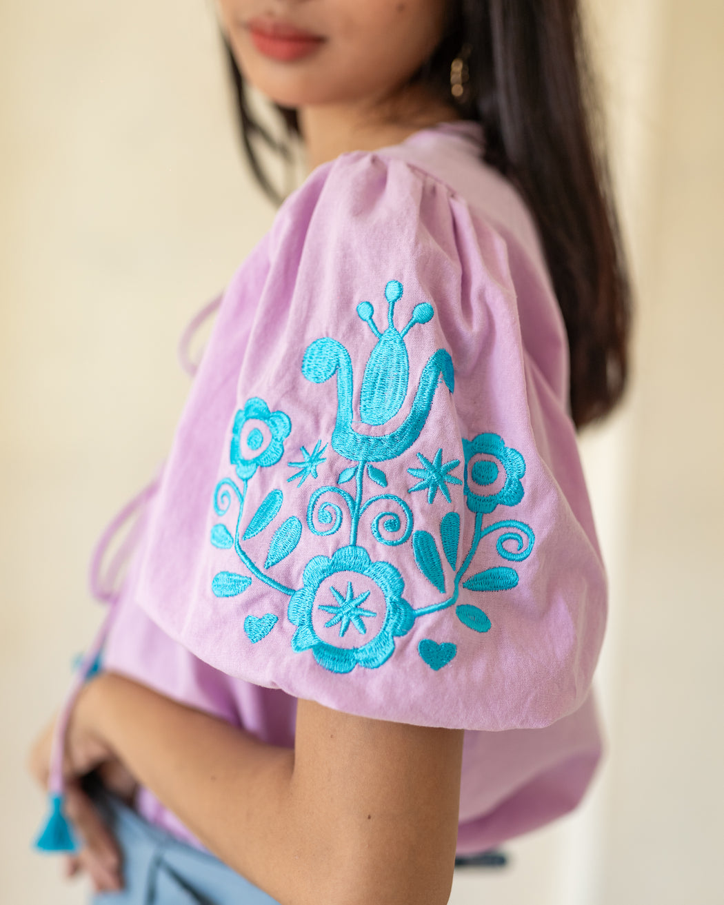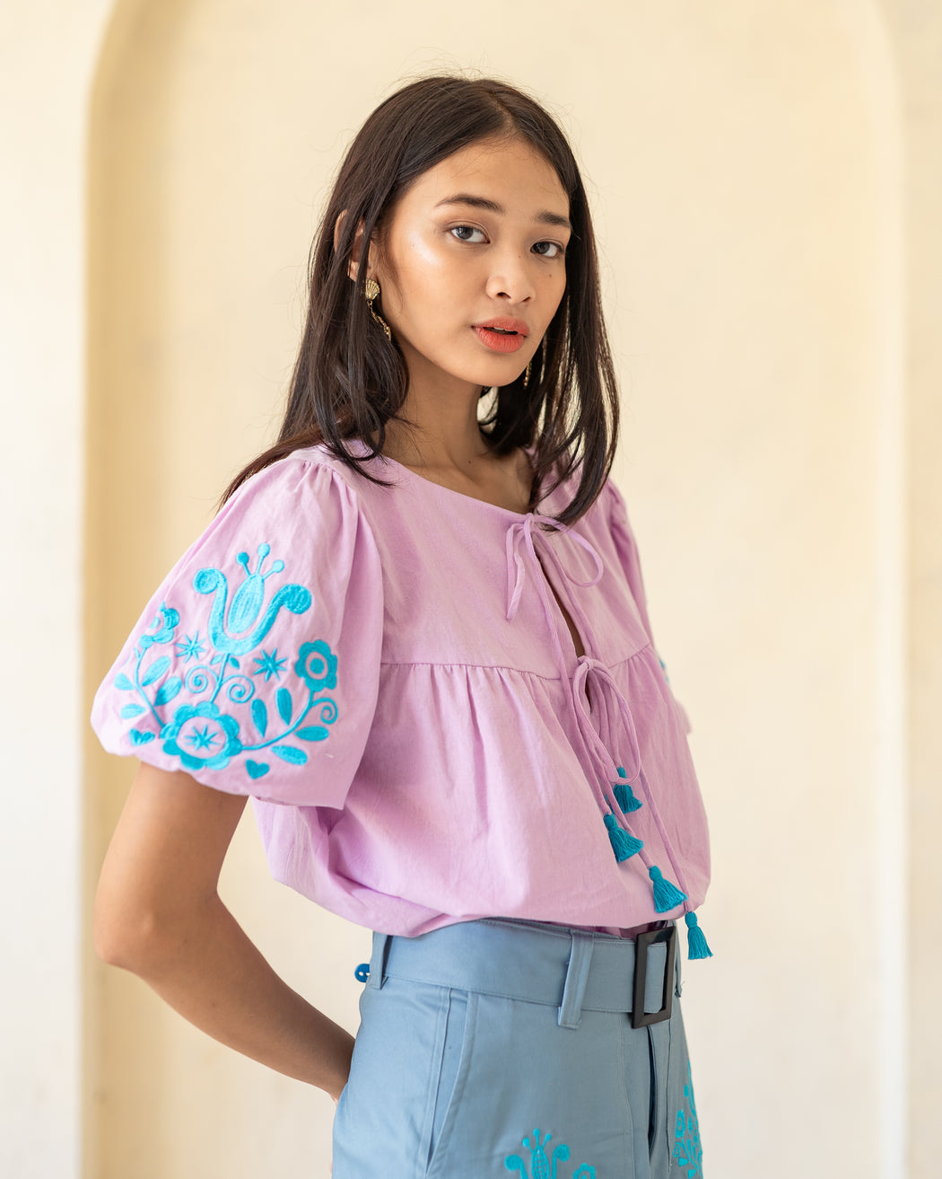 Features embroidered patterns on puff sleeves. Adorned with colored tassel on each tie ribbon