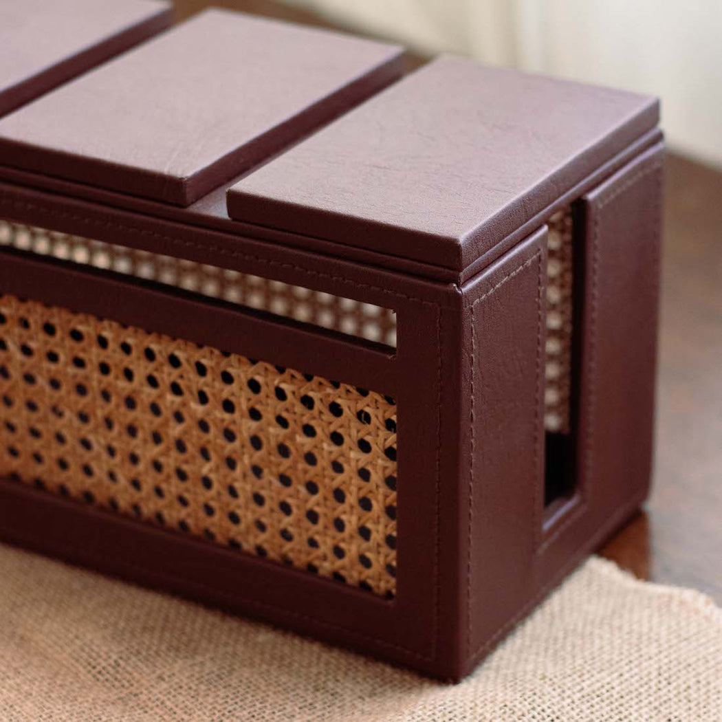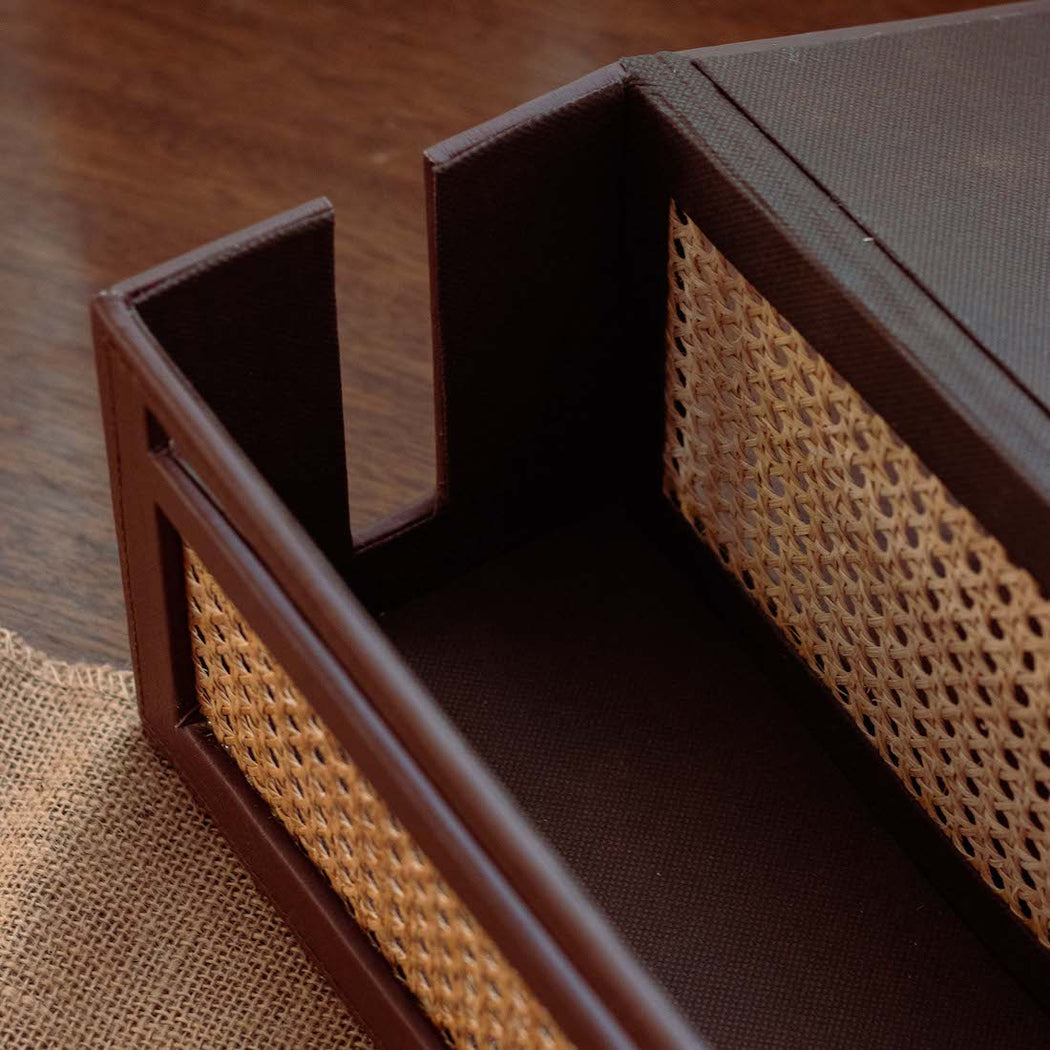 Made from chipboard wrapped in faux leather fabric and woven Solihiya mat.