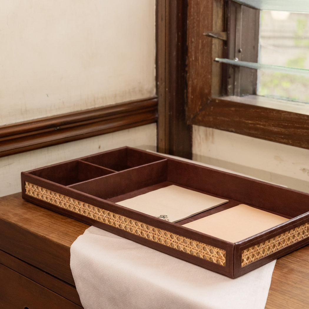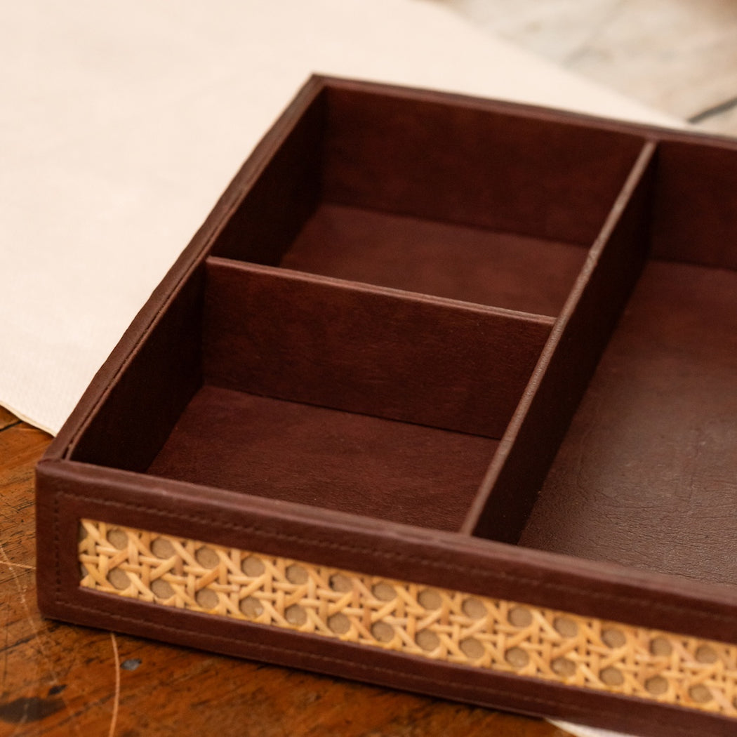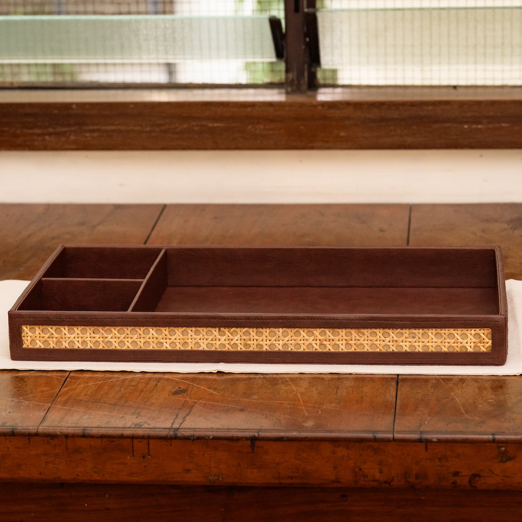 Made from dark brown faux leather and woven solihiya matting.