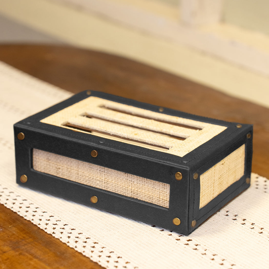 Made from plywood wrapped in black faux leather with rivets and saguran mat. matting, its woven pattern allows proper ventilation.