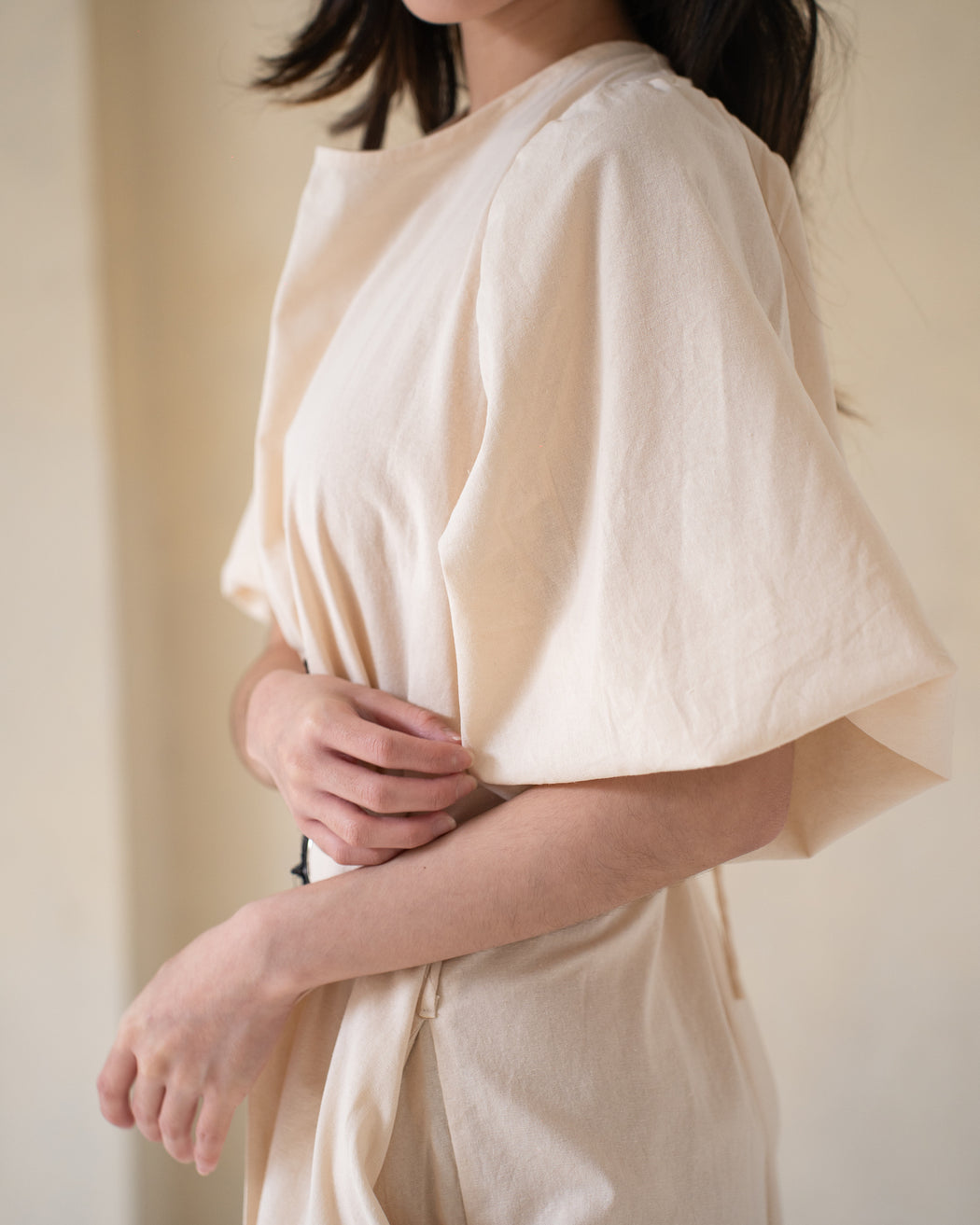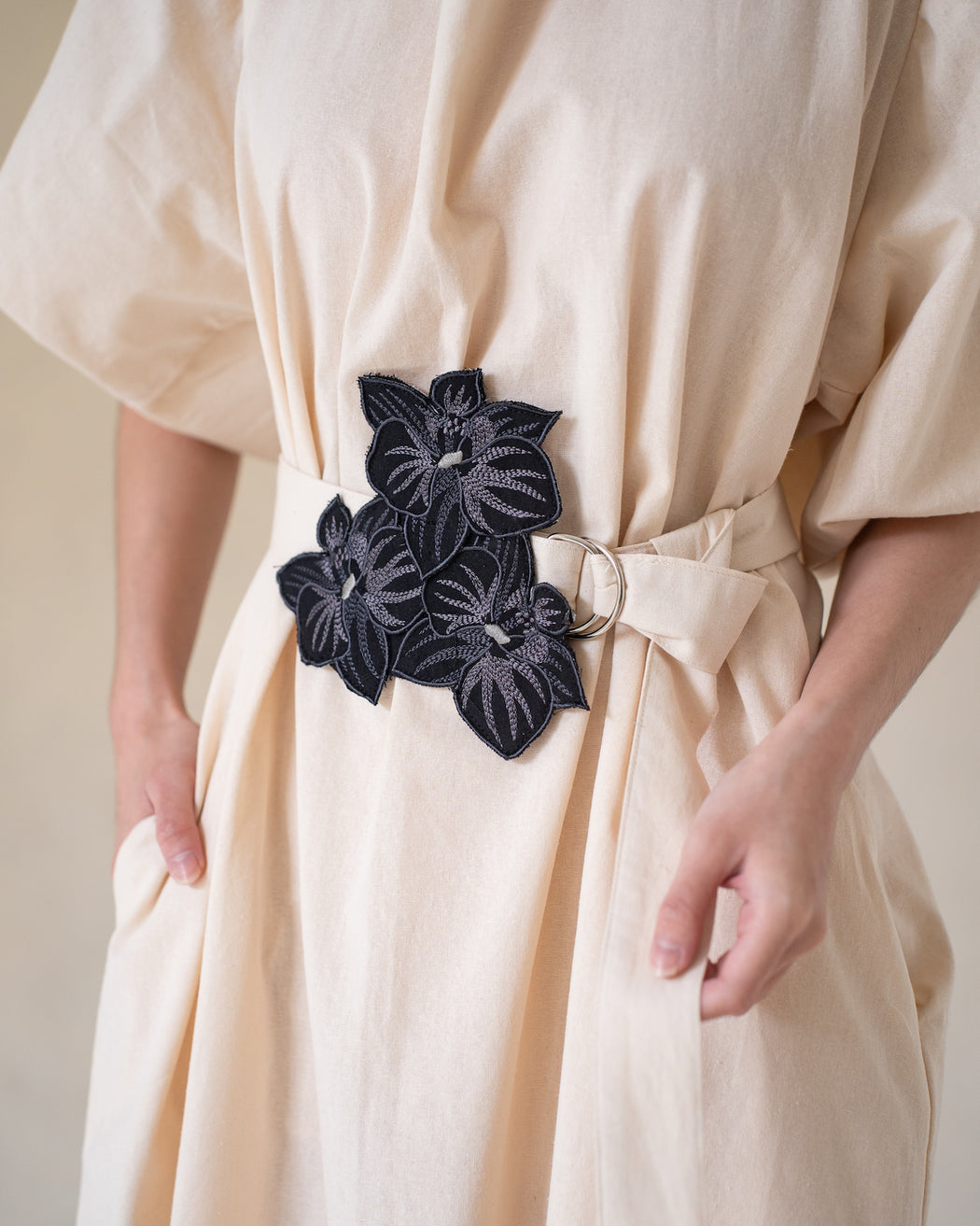 Cotton linen fabric with orchid applique belt.