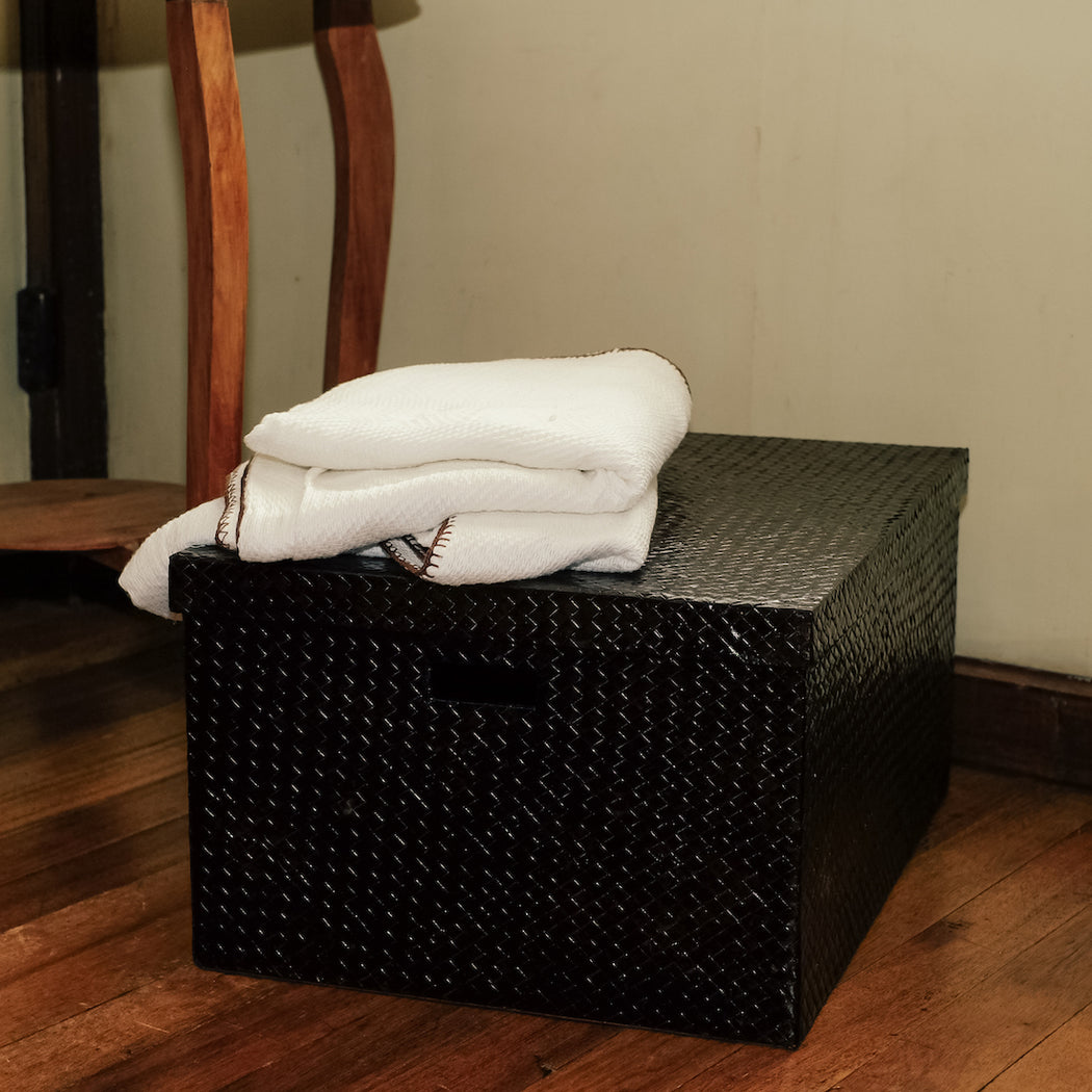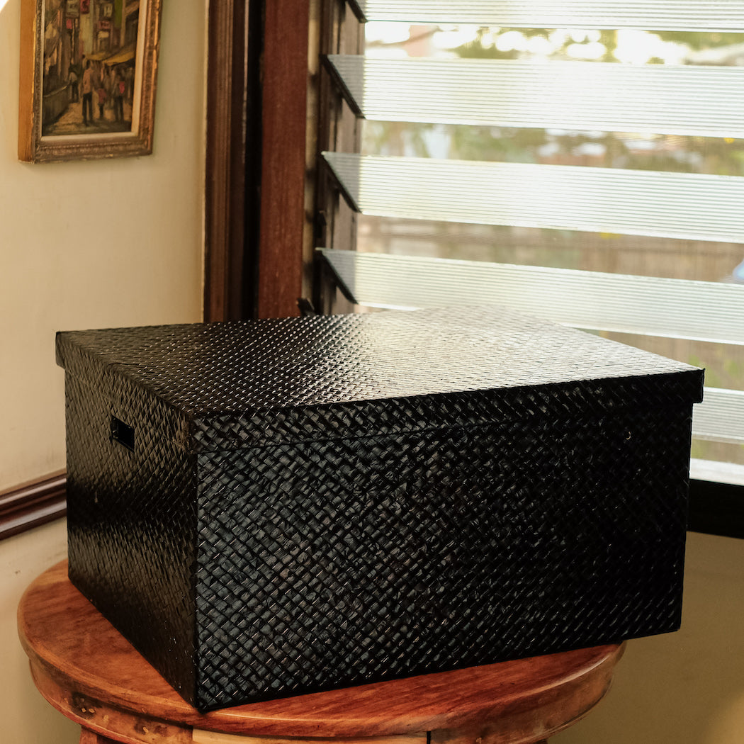 Made from woven pandan material in a deep brown hue.