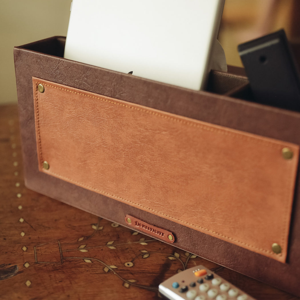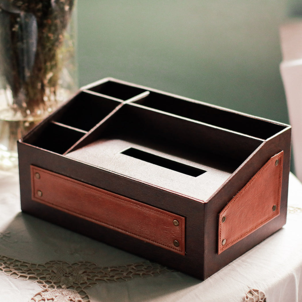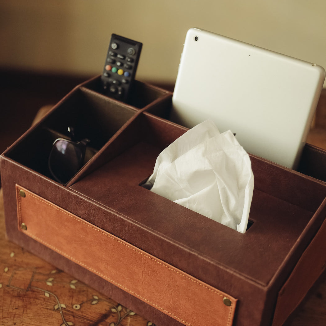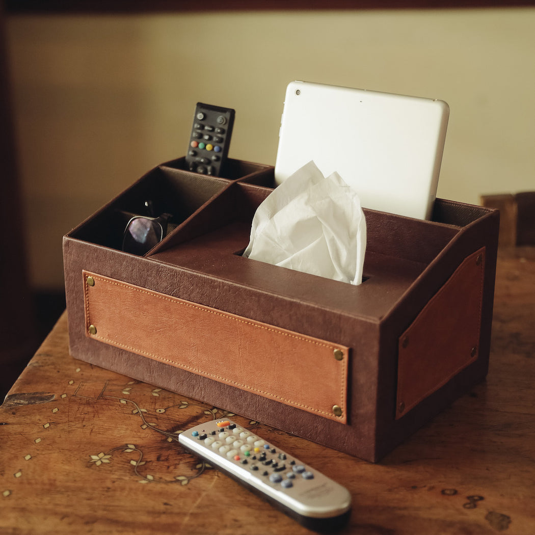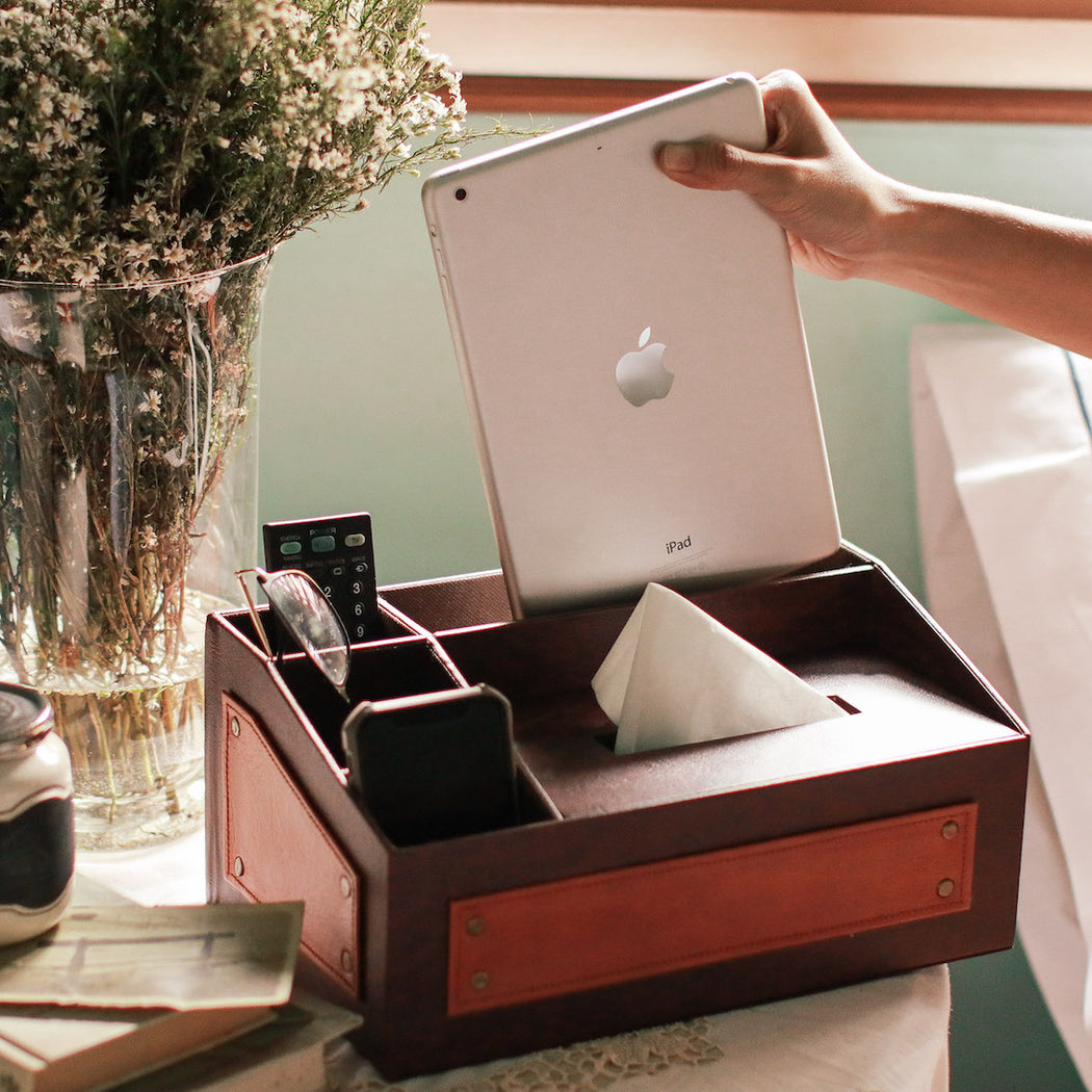 Conveniently stores your mobile phone, remote controls, tablet and tissue box.